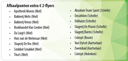 Om te kunnen genieten van de €2 kermisdag dien je gebruik te maken van de €2-flyers. Deze vind je achteraan in de Jaarmarktkrant of bij onderstaande afhaalpunten*